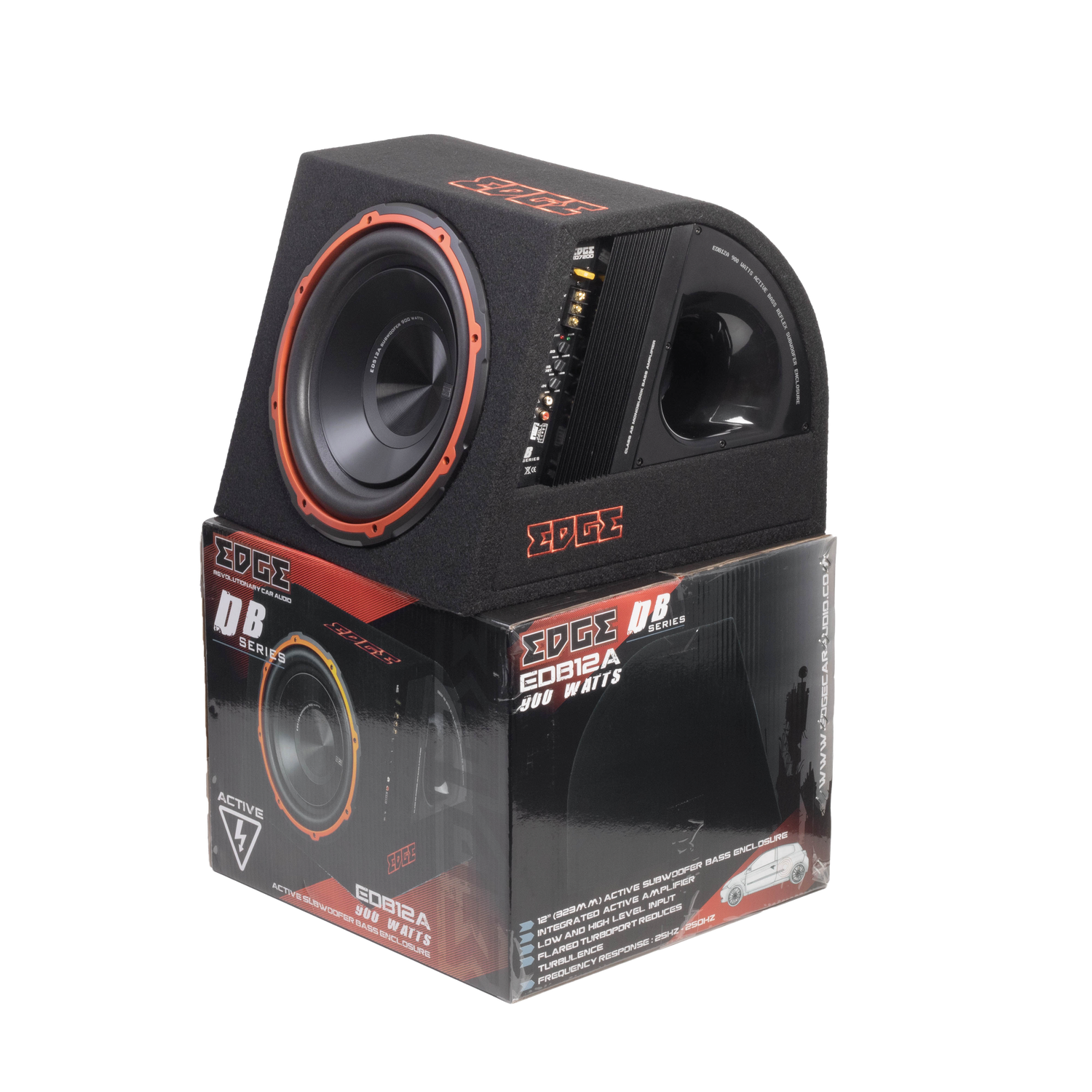 Our boxes all feature Turbo and Flared ports for smooth airflow which gives louder and more crisp bass, this paired with solid enclosure construction is a winning solution. The EDB series features a Dark design with hint of the signature EDGE orange and a new lower bass response with some component changes and alterations to the built in amplifier. This gives more depth and rumble!
